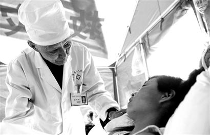 5月13日凌晨5時(shí),什邡市第二人民醫(yī)院1樓臨時(shí)手術(shù)室77歲的主治醫(yī)生張泮林剛做完地震后的第六臺(tái)手術(shù)。此時(shí),一名地震中受重傷的患者被送到了醫(yī)院。“快,立即手術(shù)!”張泮林來不及休息,立即開始為患者做手術(shù)。突然,張泮林倒在了地上,心臟停止了跳動(dòng)。經(jīng)過全力搶救,1分鐘后,張泮林的心臟才又恢復(fù)了跳動(dòng)。1天不到,身體還沒有完全恢復(fù)的張泮林,又出現(xiàn)在搶救地震受傷群眾的第一線。