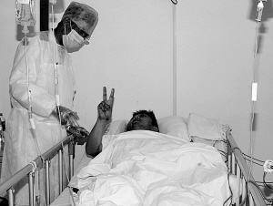昨日清晨7點,經過手術后的短時間恢復,護士為馬元江送來了他獲救后的第一餐稀飯,護士小心翼翼地將50毫升的粥慢慢地喂他喝下。到了中午12點和下午3點,又分別喂他喝下了各50毫升的營養液。昨日下午6點,馬元江看到醫生和記者在隔離區探望時,忽然做出了一個勝利的手勢,讓在場的人非常感動。