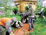 5月20日,四川臥龍中國保護(hù)大熊貓研究中心熊貓園里,大熊貓們驚恐地?cái)D在一起。往日這里竹子竹筍成堆,而今卻不見一星半點(diǎn),一只熊貓去抓籠外的觀賞竹吃,另一只熊貓居然抓了一把青草塞在嘴里。由于缺乏竹子、蘋果等食物,熊貓們只能在工作人員的幫助下學(xué)喝粥。