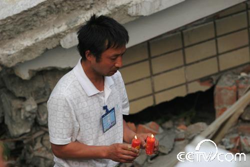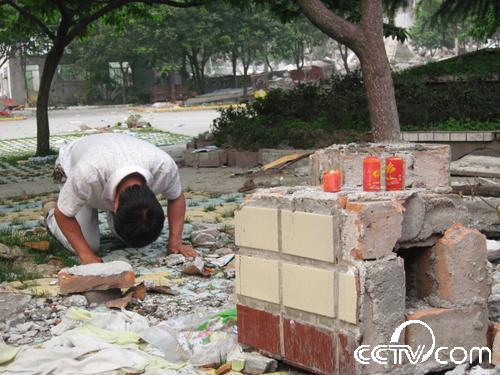 “孩子們,沒有全部救出你們我很內疚,我會記住你們忌日的,每年的這一天我都會來看你們,給你們送學習用品。你們生前都很團結,在天堂也要相互關照好,老師每天都在想念著你們!”在北川中學(新區)的廢墟下,記者看到一名中年男子跪在地上,哭得很悲傷,還向遇難的同學叩拜。記者跑過去一看,此人就是北川中學的校長劉亞春。他告訴記者,地震后他一直在忙碌搶救學生的事,沒有時間來看望這些還埋在廢墟下的數百名學生。今天他在百忙之中,抽時間來看看這些孩子們,他將帶來的蠟燭點燃后放在廢墟下,雙手合十,默默地祈禱,然后跪在地上給在地震中失去生命的學生磕了三個響頭。