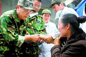 這邊的診斷才剛結束,那邊又傳來新的情況。有位年過八旬的老人跑過來,請醫生到帳篷里為自己的女兒診治。將軍二話不說,立即派出心胸外科主任李魯跟著村民坐上自己的越野車,直奔那位村民所住的帳篷。“我們這個流動醫療隊就是這樣,沿途看到哪里有災民居住的帳篷,就會過去詢問是否需要醫藥,使那些地處偏遠或行動不便的群眾能夠得到醫療救助。”