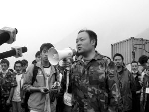 廖敏:情況很差,房子倒了很多。當(dāng)時(shí)我們餓了一天多,村民們就把掛在屋里的玉米棒子給我們,我們就烤了吃。村里的糧食儲(chǔ)備也不多,我們和鄉(xiāng)政府的人估計(jì)了一下,就能支撐個(gè)3、5天。于是我們把村民組織起來,告訴大家情況,然后限制供應(yīng)糧食,每人每天只能領(lǐng)1斤大米。14日的時(shí)候,由于擔(dān)心汶川縣城,我?guī)Я?個(gè)人準(zhǔn)備徒步去映秀,但走了8公里后,又遇到余震,山石不斷滾落,我們不得不返回原地。