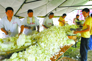 土坡上挖幾個大坑,直徑一米多的大鐵鍋架起來,半鍋水沸騰,直徑一米的大圓木桶立在鍋中!盎鹜c,再旺點。”一個小伙兒往坑內塞木板,他五米外的木板堆,近一人高。旁邊大桶的米飯率先出爐,廚師劉福彬用臉盆當飯勺。煮飯區旁邊,堆起的圓白菜面積像籃球場那么大。幾位女廚用大刀切菜。
