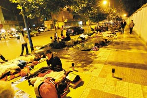 “這幾天還少了些,最恐怖的時候,市區二環周圍全部睡滿了人。”西安工程大學的一學生告訴記者,“那段時間,同學們都把床單鋪到學校操場上,一個大操場一下就睡滿了。我還有個同學為了躲避地震,沒拿到畢業證就‘逃’到北京避災去了。”