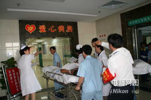記者坐上載著傷員救護車,警車開道一路綠燈直達救治的醫(yī)院,在車上傷員家屬告訴記者:到處都是我們的親人,一路上大家都很受照顧,已經感受到家庭的溫暖。下午四時許,駛進蘇北醫(yī)院,為了迎接傷員,醫(yī)院早就開始了準備,在住院十病區(qū)開辟了 “愛心病區(qū)”。王靜成院長稱,這是我們醫(yī)院最好的病房,醫(yī)院為四十名災區(qū)傷員親人配備了經驗豐富的醫(yī)護人員,確保醫(yī)療安全,盡量降低致殘率,讓他們安心治病、早日康復。