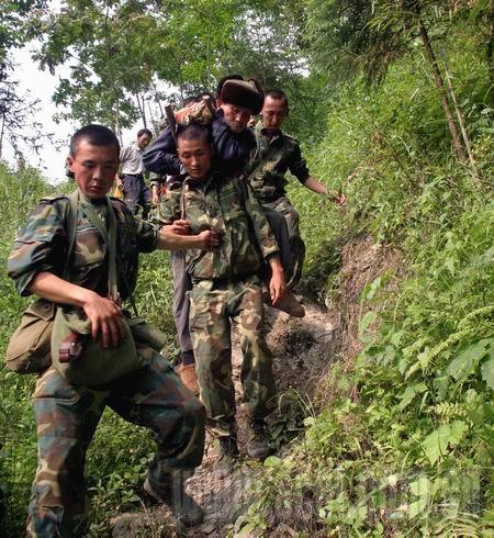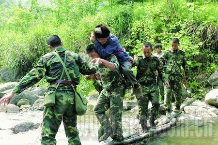 一大早,我們160人每人背著40公斤給養(yǎng)、物資、器材開始翻越這座大山。政委說,茶坪老百姓需要我們。在翻越一個峭壁時,列兵侯軍腳下一滑摔倒了,旁邊就懸崖,慶幸的是,除背囊隨著山石滾下山崖,侯軍本人安全地爬了起來。九個小時后,我們終于到達(dá)茶坪鄉(xiāng)。茶坪鄉(xiāng)副鄉(xiāng)長張平一見到我們,就撲通一聲跪在了參謀長面前說:“人民子弟兵來了,茶坪就有希望了……”參謀長一把將他扶起,兩個漢子都淚流滿面。