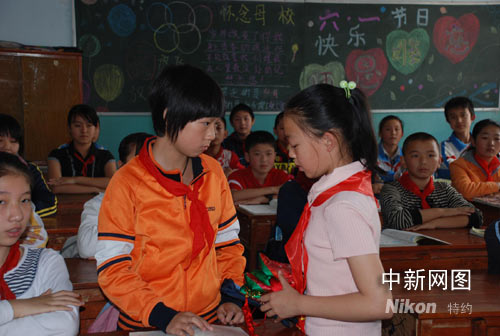 中新網吉林6月5日電(蒼雁)四川什邡地震災區的女孩廖涵來吉林市投奔親屬,豐滿區英語實驗小學免費安置其入學。端午節前夕,吉林市另一所學校的一名12歲女孩帶著全班64名學生的心愿前去探望廖涵,并送去祝福荷包。