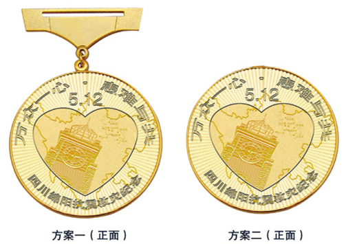 趙琛說,紀念章有著特殊的表現形式。內輪廓為心型,代表全國人民萬眾一心支持綿陽賑災;外輪廓為圓形,象征太陽。整個紀念章的正面寓意為“心中太陽升起”,表達四川綿陽人民重建家園的信心和力量。