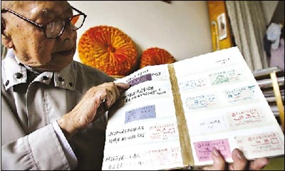 吳世茂老人展示他收藏的紙質地鐵車票。記者 周民 攝