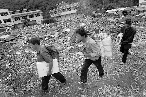 有村民肩上背著從廢墟中扒出的幾十斤臘肉,有的用被單裹著幾件單衣,空隙處,塞滿(mǎn)牛奶和火腿腸。