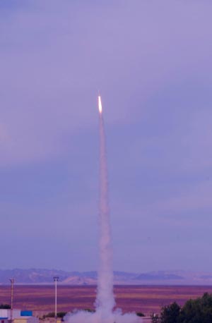 “3,2,1,點火!”昨天上午8時,酒泉衛(wèi)星發(fā)射中心。一聲令下,北京航空航天大學宇航學院學生王虹玥沉著地按下了電子點火按鈕。“嘭”的一聲,“北航一號B”火箭尾部瞬時噴出一股耀眼的火焰,箭體呼嘯而出,留下一道白煙直刺入萬米高空,在廣袤的西部沙漠中,伴隨著一輪噴薄而出的紅日,鐫刻成一幅完美的畫面。