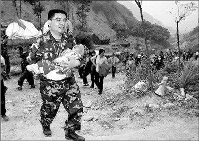 5月14日下午1時(shí),先期到達(dá)的陳光標(biāo)步行8公里來(lái)到受災(zāi)嚴(yán)重的北川中學(xué)。盡管已經(jīng)有心理準(zhǔn)備,但眼前的景象還是讓他驚呆了——隨處可見(jiàn)從廢墟中伸出來(lái)的手、腳、頭,許多學(xué)生的身軀被壓在廢墟下。“看到那種景象,任何人都不會(huì)平靜,我唯一能做的,就是不顧一切地去救那些孩子。”回憶起當(dāng)時(shí)的場(chǎng)景,陳光標(biāo)目中含淚,聲音嘶啞。
