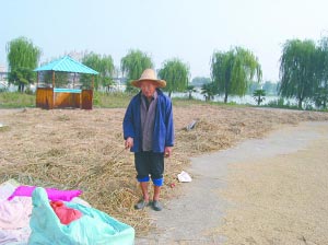 夏天,老百姓在公園內的水泥地上曬糧食。