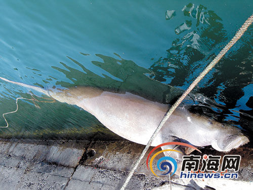 23日上午,記者在東郊椰林旅游碼頭海邊見到了這條已經(jīng)死亡的“怪魚”。東郊鎮(zhèn)政府的相關(guān)工作人員已經(jīng)趕到現(xiàn)場。這條魚軀體龐大,長3米,全身呈灰白色,重約1000斤。與其他魚不同的是,這條魚的頭部,尤其是嘴巴和豬特別相像,嘴巴上唇還長滿了堅硬的“胡須”。前往現(xiàn)場圍觀的村民們告訴記者,他們從來沒有見過這種魚,因為它的頭很像豬頭,大家都稱它“豬頭”魚,或者“海豬”。