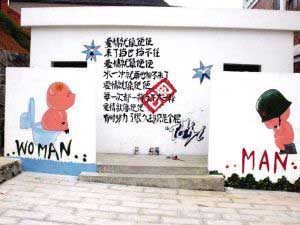 作者自述:聽當地居民講,這本來只是一座很普通的公廁,后來畫上卡通畫、配上搞笑的文字,最可愛的是一個大大的“已閱”紅印蓋在打油詩上。我猜想,這個做外墻裝飾的弟兄是不是剛失戀,將自己的滿腔感受在廁所外墻上來了個寫照?