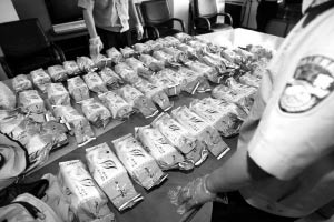 “天盾”行動中繳獲的用茶葉包裝袋裝好的毒品。