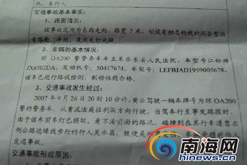 在吳水昌提供給記者的“交通事故認(rèn)定書(shū)”上,記者看到樂(lè)東警方對(duì)此案的認(rèn)定為:“2007年9月26日20時(shí)10分許,黃云駕駛一輛車(chē)牌號(hào)為瓊OA200警的警務(wù)車(chē),從黃流法庭往利國(guó)方向行駛。當(dāng)駕車(chē)行至事發(fā)路段時(shí),由于該車(chē)前車(chē)燈已損壞,看不清前面的路況,碰撞到在其行車(chē)道靠右側(cè)公路邊緣線步行的行人吳水昌,致使吳水昌受傷,車(chē)輛受損的傷人事故。”