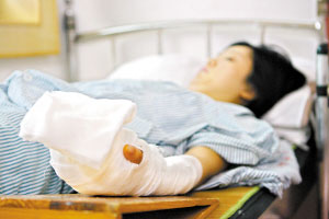 3名年輕女子在一家俱樂部唱完歌后遭一男子騷擾,在隨后的沖突中這名男子竟咬下其中一名女子的一截手指頭,另兩名女子也不同程度地受傷。昨日(29日)下午,記者在廣州和平手外科醫院見到了躺在病床上的劉女士。已接受再植手術的劉女士左手纏著厚厚的紗布,小指最上面一截已經明顯發黑。