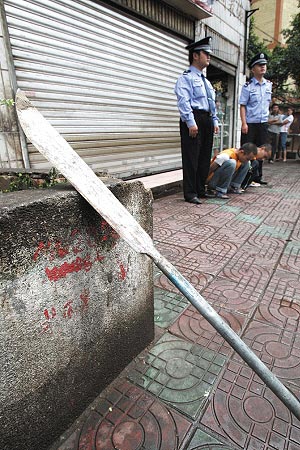 孔勁到達(dá)現(xiàn)場(chǎng)后,看到了觸目驚心的一幕:4名男子正在亂砸燒烤店的物品,其中一人揮著一把長(zhǎng)約1.5米的大刀瘋砍。現(xiàn)場(chǎng)已經(jīng)倒下一名年輕男子,該男子頭部鮮血直流。