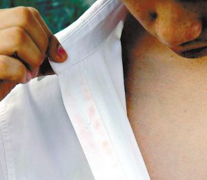 小黃驚訝地發現,自己貼身穿了一段時間的衣服上面,東一塊西一塊全部是紅色的印跡。由于當時小黃穿的是一件白襯衫,紅色的印跡顯得格外清晰。