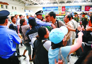 71歲的乘客曾國斌稱,“對方一婦女朝我們中的女同志罵了一句臟話。大家被激怒了,有人將礦泉水瓶、方便面飯盒砸向了那名罵人的婦女。”此后,機場保安、警察等趕到現場。激動的乘客開始用椅子砸辦公桌及電腦,警察在制止過程中,雙方發生相互撕扯。李娟稱,期間她被一穿著“輔警”字樣的保安踹了一腳。