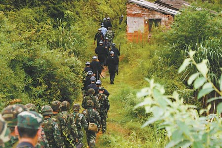 案發(fā)當(dāng)天晚上7時(shí),永豐縣委政法委就從各個(gè)鄉(xiāng)鎮(zhèn)抽點(diǎn)干部和民兵預(yù)備役人員配合警方圍捕嫌犯。于此同時(shí),吉安市公安局特警支隊(duì)、武警江西總隊(duì)吉安支隊(duì)也都派出大批警力連夜趕赴到永豐增援。特警支隊(duì)長(zhǎng)朱小明說(shuō),他們除了參與搜山外,還擔(dān)負(fù)堵截、埋伏和狙擊的任務(wù)。永豐縣委副書記、政法委書記劉曉聰說(shuō),圍捕工作分為四大塊,主要是偵查、堵卡、調(diào)查取證和搜山,參與圍捕的人數(shù)超過(guò)800人。