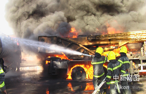 一中隊(duì)于09時(shí)34分到達(dá)火災(zāi)現(xiàn)場(chǎng)后經(jīng)觀(guān)察及詢(xún)問(wèn)知情人,停車(chē)場(chǎng)院內(nèi)1輛載重28.58噸凝淅油油罐車(chē)和3輛吊車(chē)著火,鄰近的另外3輛吊車(chē)、20余輛貨車(chē)及汽車(chē)修理鋪受到威脅,油罐隨時(shí)發(fā)生爆炸,如不及時(shí)控制火勢(shì),造成的后果將不堪設(shè)想。
