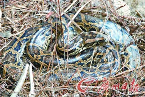 甘濟源說,當他走到屋后放在屋檐下的一堆雜草中翻尋時,竟發現草叢中還藏著另一條灰黑間黃的大蟒蛇,蛇腹下還堆著一團20多個直徑20多厘米的橢圓形蛇卵。