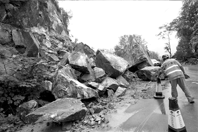 事發地點位于109國道距門頭溝城區4.5公里處,該路右側一座20余米高的山坡發生滑坡。昨天上午11點,記者看到,一塊十幾立方米的巨大石塊占據了整條公路的一半,一輛鏟車正在對滑落的石塊進行清理。據工人介紹,昨天凌晨零點,該路段右側山體發生滑坡。凌晨兩點左右施工人員將碎石清理后,臨時打通左側進京方向的道路。早上7點多,北京路橋瑞通養護中心八處搶險隊帶著大型機械設備趕到現場搶險。交管部門將滑坡地點至軍莊道口長達數公里的道路封閉。