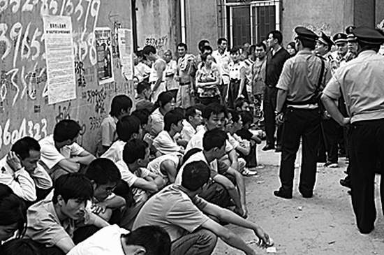 記者隨同民警清查時(shí)發(fā)現(xiàn),樓房?jī)?nèi)幾乎每個(gè)房間都是房門緊鎖,任由外面的民警怎么敲門,里面的人就是不開門。在二樓的一個(gè)房間外,民警敲門足足幾分鐘始終無(wú)人開門,于是將門鎖撬開進(jìn)入,發(fā)現(xiàn)簡(jiǎn)陋的客廳里,靠四周墻壁坐著20多個(gè)年輕人,男的占大多數(shù)。