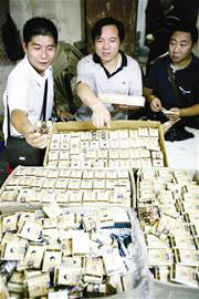 據(jù)調(diào)查,當(dāng)晚查獲的新型卷煙接嘴機(jī)是由李雪君團(tuán)伙剛從福建托運(yùn)至武漢,而現(xiàn)場(chǎng)查獲的假冒高檔“黃鶴樓”卷煙,均是由7月27日在漢陽(yáng)花園村繳獲的煙機(jī)生產(chǎn)。據(jù)交代,他們更換煙機(jī)的目的,是提高生產(chǎn)效率和制假水平。