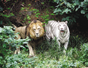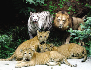據了解,獅虎獸的父母是一只雄性非洲獅和雌性孟加拉白虎“小雪”,都是2002年在紅山動物園出生的,一起生活在“獅虎生態園”,感情很好。當初跟它們一起關進園里的還有另外五只猛獸,包括兩只母獅,一公一母兩只虎,以及一只母白虎。可是這只雄性非洲獅就是喜歡跟“小雪”待在一起,對自己的同類——兩只母非洲獅反倒不理不睬。后來,工作人員先后移出了兩獅兩虎,園里只留下“小雪”、雄性非洲獅,和一只母東北虎。園子里“太平”了,“小雪”跟它的獅“哥”更是形影不離,親密不已,那只母東北虎成了“電燈泡”。