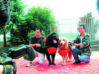 婚禮現場,保國、千金被雙方的主人牽著踏上紅地毯。保國又蹦又跳,不停地大聲吼叫,像個斗士;千金則要溫順得多,慢慢地跟著主人走。拍結婚照的時候,戴著大紅花的兩只藏獒格外精神。隨著主持人一聲“禮成”,彩紙漫天飛舞,兩只藏獒被牽入裝修一新的“洞房”。