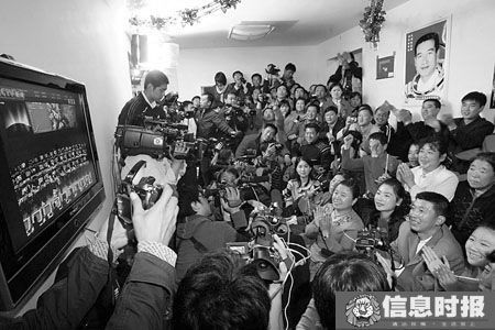 昨天21時10分,隨著神七騰空而起,航天員翟志剛家客廳里,20多名親友和數(shù)十名記者齊歡騰,翟家人搖著紅旗,親友們和個別記者激動得流下熱淚。100萬響鞭炮在“新居”響起,絢爛煙花綻放,現(xiàn)場一片喜慶。