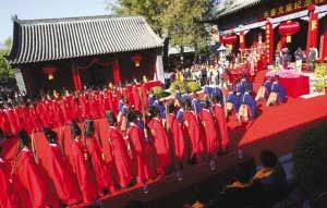 “今年的祭孔活動很多地方與歷年有所不同。”據(jù)工作人員介紹,今年的祭品一改每年的三牲祭祀,祭品用直徑1.5米的生日蛋糕,以呈現(xiàn)現(xiàn)代祭孔的特點。記者在大典現(xiàn)場了解到,今年的祭孔大典還適逢文昌閣暨國學大講堂工程竣工,文昌帝君像也揭開神秘面紗,正式落戶長春文廟。由各地傳統(tǒng)文化愛好者捐贈的大型孔子圣跡圖碑刻,工程歷經(jīng)3年之久,也以壯觀的場面頒上圣墻,精彩再現(xiàn)先師教育風范。此外,今年的祭孔表演,在保持著每年的大型仿古祭孔樂舞的基礎上,還為觀眾獻上一臺精彩的大型箏樂和漢服箏舞。活動現(xiàn)場,長春文廟還免費向參禮群眾發(fā)送傳統(tǒng)蒙學讀物《弟子規(guī)》及新儒學兒童讀物《海叔的禮物》。(記者 齊晟博)