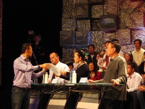 主持人:OK。你們這三個人的位置很特別,三點成一直線,你們簡直是一個鼻孔出氣的。有反對的,反對,好,這邊這位小姐請。掌聲歡迎她,請,(掌聲)