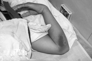 13日,記者在道外區太平人民醫院見到了燕燕。在燕燕的乳房上,記者看到多處硬幣大小的外傷,她頭頂部的一縷頭發已經被燒焦。燕燕說這都是小峰用蠟燭燙的和燒的。燕燕的右胳膊綁著鋼板,雙肩及鎖骨處都纏著醫療用背帶,左大腿及臀部一大片淤青,一道道劃傷赫然醒目,左腿膝蓋處有一塊乒乓球大小的部分,肉還翻在外面。燕燕說這些都是她跳樓時摔傷和刮傷的。燕燕不時地哭鬧,喊著頭疼。在14日對燕燕進行的頭部CT檢查中,證實燕燕顱內出血。