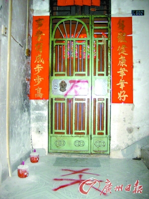 記者于當天上午10時接報來到該住宅小區了解情況。在該小區一名知情的居民蔡先生的帶領下,記者見到,至華 苑小區6座的302、602、303、403四戶人家的防盜門上均被寫上“殺”、“死”兩個字,其中兩家門外的白墻也被噴上類似詛咒語。黃先生家在602,他家的門和門外的地板瓷磚都被噴上詛咒語。