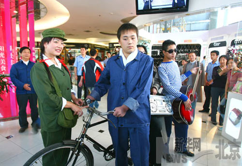 在新世紀服裝商貿(mào)城商場內(nèi),一個改革開放30年服裝變遷展覽與行為藝術展示同時進行。人們在商場的櫥窗內(nèi)看到:布票、海魂衫、皮爾·卡丹……一系列上世紀七八十年代以來的社會流行用語首先映入眼簾。在櫥窗外,身穿各個年代“標志性服裝”的模特,分別代表著工人、市民和學生等不同身份的人群。