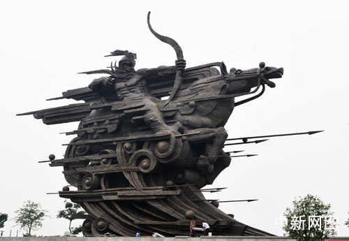 中新網(wǎng)杭州10月23日電(記者 龔讀法 實(shí)習(xí)生 王磊 通訊員 濱宣)日前,歷時(shí)兩年的巨型雕塑《錢王射潮》在浙江省杭州市濱江公園正式揭幕。這尊雕塑的是由中國工藝美術(shù)大師韓美林設(shè)計(jì)的,雕塑高29.6米,寬48米,厚15米,全部采用性能優(yōu)良的錫青銅鑄造而成,總重量達(dá)300余噸。