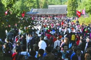 昨日,香山公園東門外擠滿了等候進(jìn)園的游客。當(dāng)日,香山游客達(dá)到8萬人。