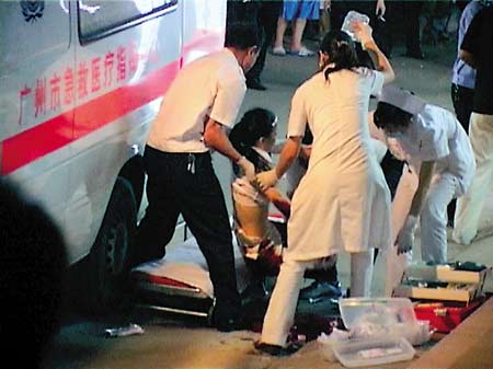 今日凌晨1時許,記者趕到新市蕭崗涌北大街43號一小食店門前,看見一名穿著白色上衣的女子躺在地上,身旁是一把沾滿鮮血的菜刀。該女子左耳朵連同臉上的肌肉被劈了下來,只有一絲皮肉連著。左手臂骨頭被砍斷,致命的一刀砍在腰部,腰椎被砍斷,腸子從傷口處流了出來。醫(yī)務(wù)人員對其進行包扎搶救后,抬進救護車送往醫(yī)院搶救(見左圖)。