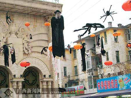11月1日是西方傳統的“鬼節”——萬圣節。10月30日,為迎接萬圣節,南寧市古城路某娛樂城在門口懸掛了一些青面獠牙的假人。娛樂城這一特殊的“廣告”引來了爭議。
