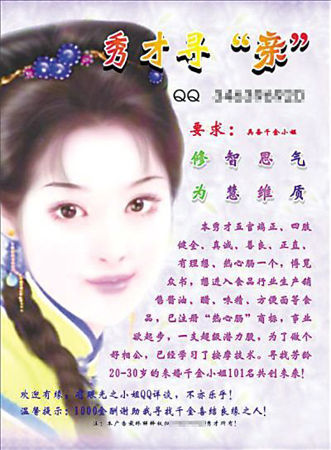 昨日,記者在楊家坪楊馨酒店外的廣告宣傳欄上看到這則由A4紙打印的征婚廣告,上面還有一張古典裝扮的美女圖。廣告上寫(xiě)到:“本秀才五官端正,四肢健全,真誠(chéng),善良,正直,有理想……目前有形資產(chǎn)6位數(shù),無(wú)形資產(chǎn)9位數(shù),未來(lái)的億萬(wàn)富翁,慈善家……尋找芳齡20~30歲,電視連續(xù)劇《上海灘》里馮程程類(lèi)型的未婚千金小姐101名共創(chuàng)未來(lái)!(1名共創(chuàng)家庭,100名共創(chuàng)事業(yè))”廣告上,除了一個(gè)QQ號(hào)碼外,沒(méi)有留下其他任何聯(lián)系方式。