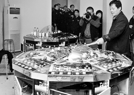 下午3時20分,記者隨民警來到經二路一家沒有任何店名的門面房前。這個賭博窩點已聞訊關上了防盜門,記者注意到,門外還張貼著招聘服務員的啟事。民警強行將門打開,只見50多平方米的屋內已空無一人,里面擺著30多臺“動物樂園”等3種賭博機。門口一中年婦女告訴記者,這家賭博廳開業已有一個月了,“他們害人害己,早該取締了。”