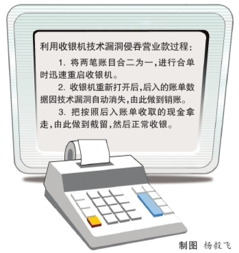 發現這個“秘密”后,楊某打起了歪主意。“當天打烊時,我合了兩份單并重啟了收銀機,利用技術漏洞銷掉其中一筆100元的賬,將已收的100元現金拿走。擔心了一夜,結果第二天風平浪靜。”