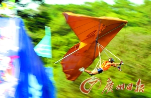在這次的“鳥人賽”上,以往創造的25米飛行記錄終于被來自珠海本地的一名飛行愛好者打破。在昨天的飛行比賽中,珠海當地一家飛行俱樂部的會員李志和駕駛著心愛的三角翼飛行器——“天翼弄人”在快速奔跑后,從8米高的高臺上向著前方的水面漂去,在一片掌聲中,李志和以26米的飛行距離創造了新的飛行記錄。