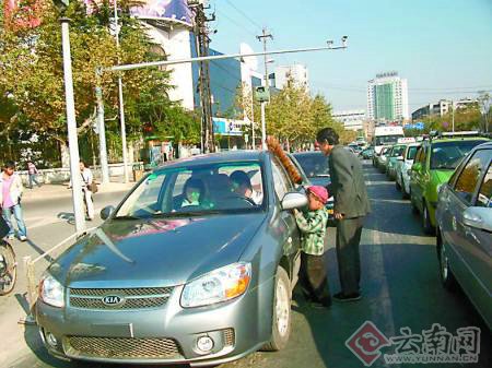 手拿雞毛撣子,見車停下等信號燈就趕忙上前掃車,當車主打開車窗看究竟時,立馬伸進一只手并索要清潔費,你要不給錢接下來還有一招——下跪。近日,守在昆明市各大路口的要錢族又出新花樣——拿雞毛撣子掃車窗,有人戲稱他們是掃灰族。