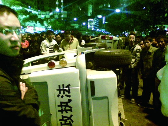 20時30分,3輛停在路邊的行政執法局執勤公車成了攤販發泄的對象,十余位攤販依次將前兩輛車子掀翻在地,另一輛執勤的皮卡車被他們一起推到機動車道上,用來擋住其他車輛通行。