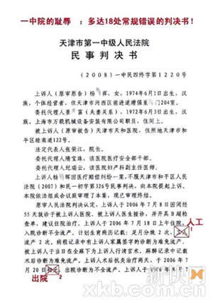 一篇名為《天津某法院多達18處低級錯誤的終審判決書》出現在某論壇上。一位網名是“哭泣不是懦弱”的發帖人在帖子中寫道:“這是我2008年11月7日領到的法院終審判決書。一份僅6頁的判決書,光錯別字、丟字等低級錯誤就有18處。這樣一份錯誤百出的終審民事判決書還赫然蓋上了"××法院"的公章。難道法官就是這樣的工作態度嗎?法律的權威與神圣蕩然無存!”